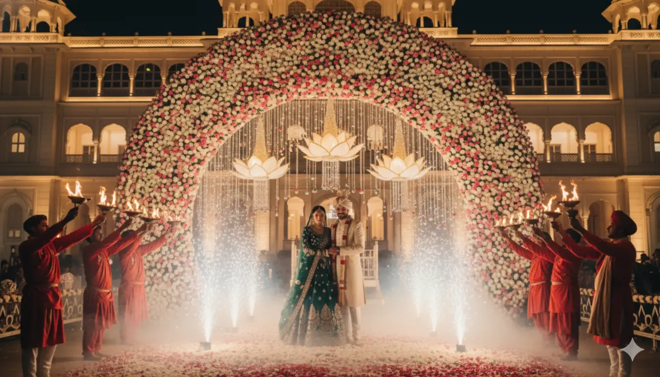 A grand entrance accompanied by priests, shankhnaad, and traditional music.